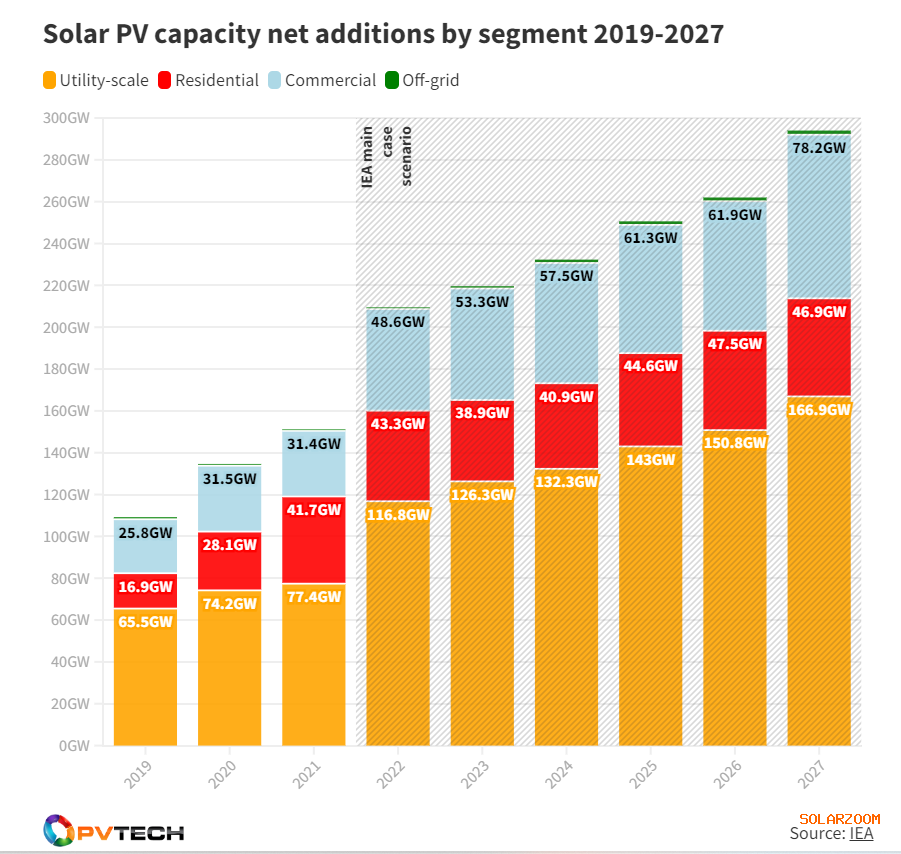 而太阳能光伏发电中,分布式光伏应用将是太阳能光伏快速增长的关键,全球户用和商业屋顶市场的开发将会加速以助力减少能源费用。至2027年,分布式光伏市场的年增量或达到170GW。