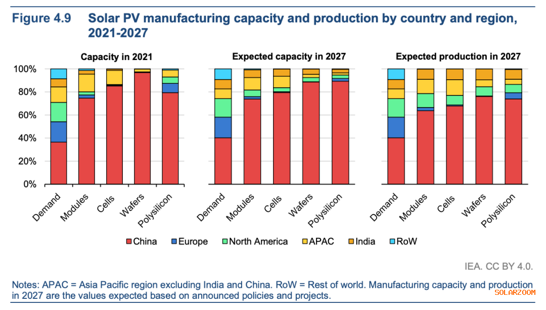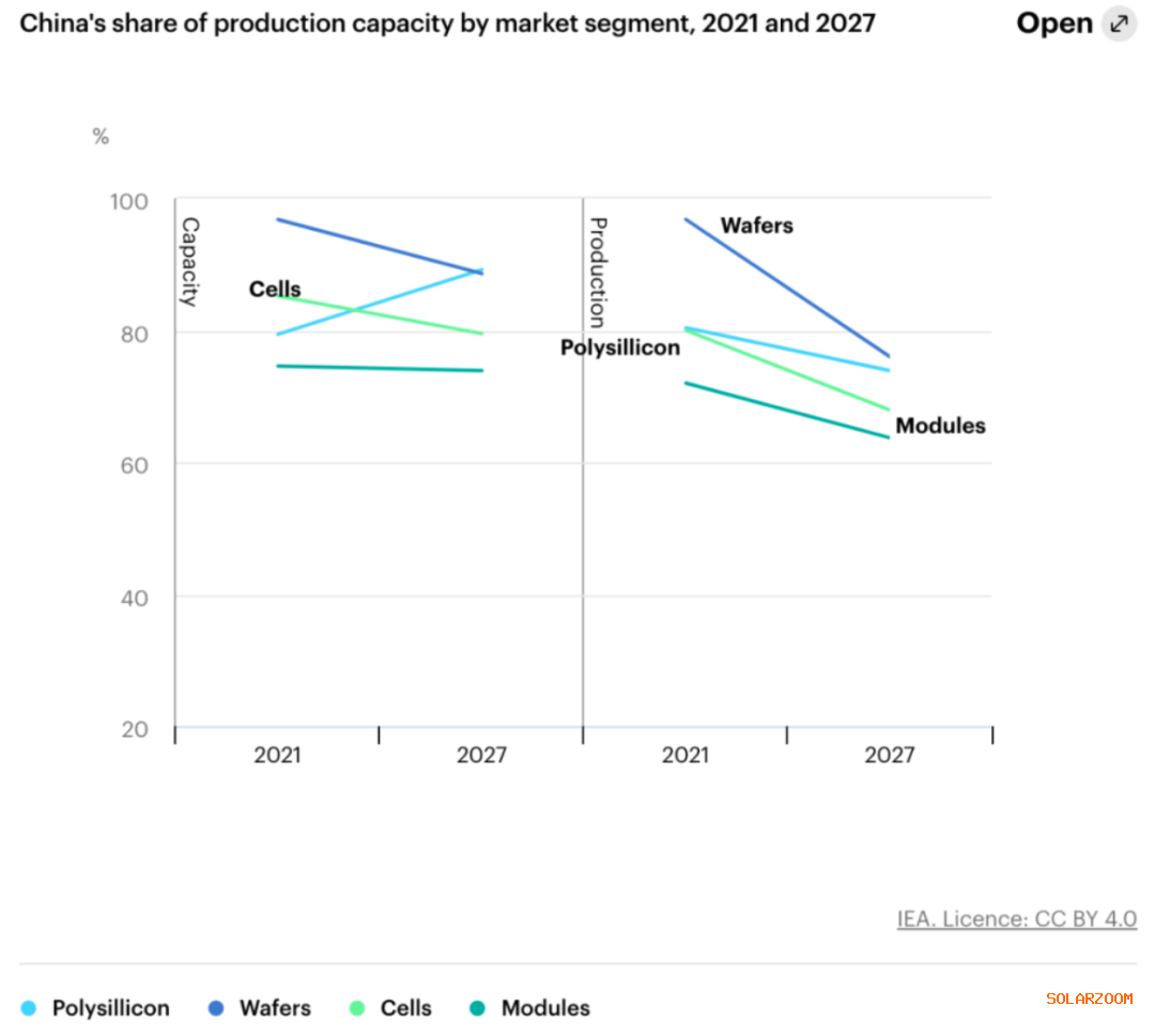 值得注意的是,虽然中国在接下来的几年里仍然是主导国,但全球太阳能光伏制造供应链正在出现多样化迹象,随着美国、印度等市场新政策的实施,到2027年,中国在全球光伏制造中的市占比可能会从目前的90%下降到75%。