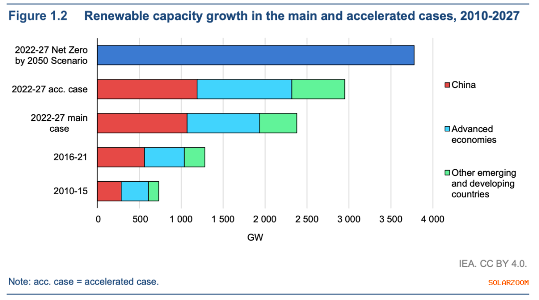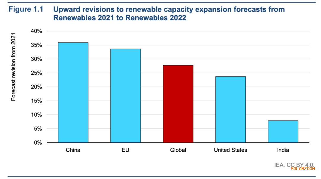 除了中国,欧盟、美国和印度实施的新法规和市场改革措施,如REPowerEU、通货膨胀削减法案(IRA)和产能挂钩激励机制(PLI),也将加速可再生能源的增长。