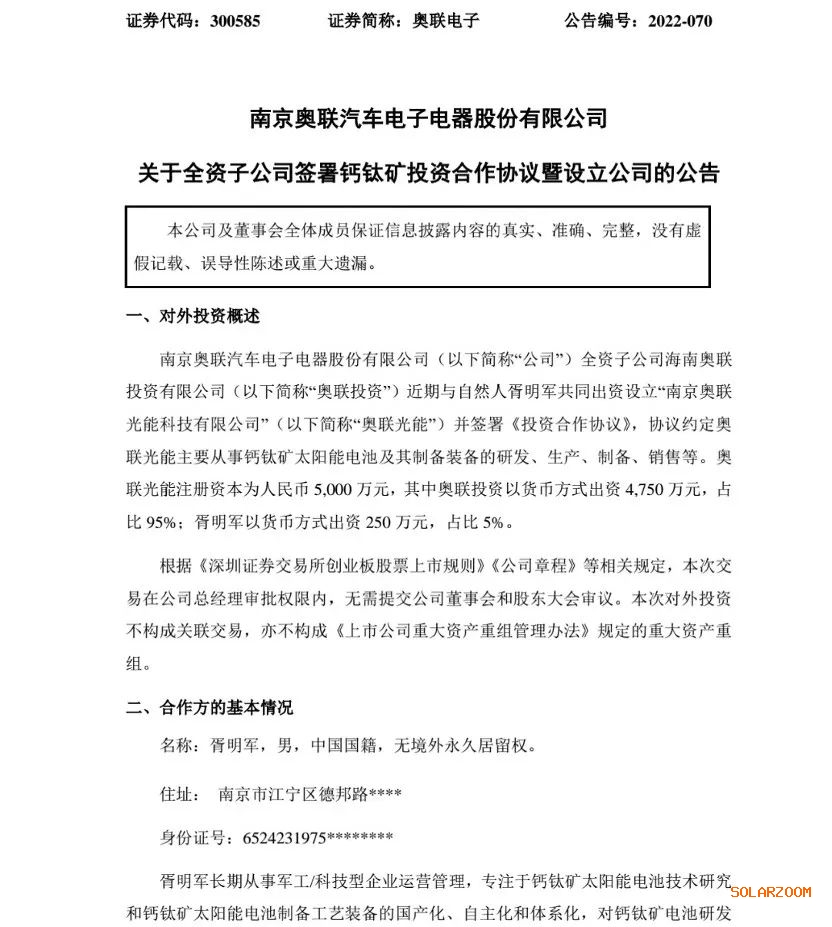 公告称,双方将合作设立钙钛矿太阳能电池公司奥联光能。合资公司拟定主营业务为钙钛矿太阳能电池及其制备装备的研发、生产、制备、销售等,注册资本为5000万元,其中奥联投资以货币方式出资4750万元,占比95%;胥明军以货币方式出资250万元,占比5%。