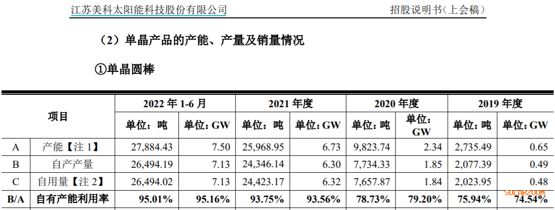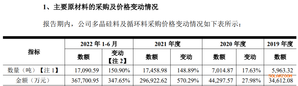 再来看美科股份的生产信息,美科股份的核心产品单晶硅片的上游环节为单晶圆棒,公司所需单晶圆棒大部分为自产,也即采购来多晶硅料和循环料后,借助于单晶炉制造单晶圆棒。根据招股书披露,美科股份的自产单晶圆棒2021年产量为2.43万吨,相当于2020年0.77万吨的三倍以上;但与此同时,2021年采购的多晶硅料和循环料数量却为17458.98吨,仅相当于2020年采购量7014.87吨的2.5倍以下,显著低于同期单晶圆棒产量的增幅。