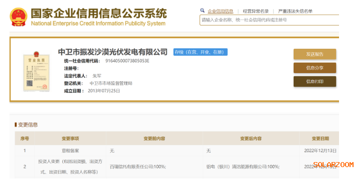 12月16日,百瑞信托有限责任公司(以下简称:百瑞信托)转让中卫市振发沙漠光伏发电有限公司(以下简称:振发沙漠光伏发电)100%股权,铝电(银川)清洁能源有限公司(以下简称:铝电清洁能源)。