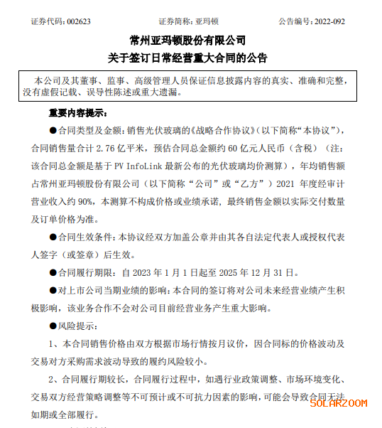 其中,亚玛顿在公告中称,其与晶澳科技签署了《战略合作协议》。从2023年1月1日起到2025年12月31日,其预计向晶澳科技销售光伏玻璃2.76亿平方米,预估总金额约60亿元。