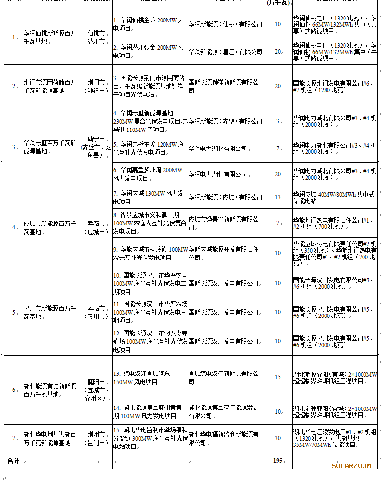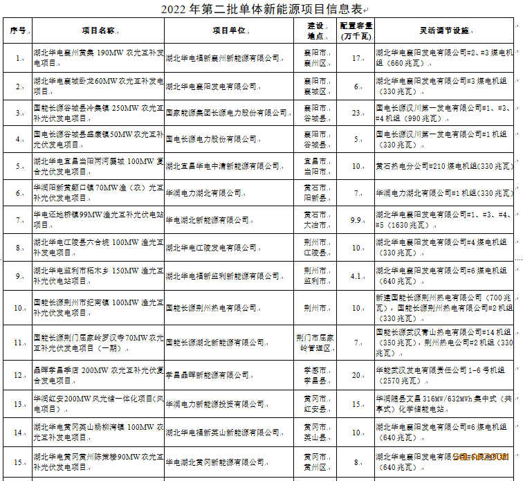 之前,湖北省能源局公布了2022年第二批纳入建设规模管理的新能源发电项目名单。此次公布的7个风光火储新能源百万千瓦基地(二期)项目共计15个,容量195万千瓦。其中:风电项目6个、容量88万千瓦;光伏发电项目9个、容量107万千瓦。常规单体风电和光伏发电项目共计20个,容量232万千瓦。其中:风电项目3个、容量45万千瓦;光伏发电项目17个、容量187万千瓦。风电项目应在2024年底前全容量并网发电,光伏项目应在2024年6月底前全容量并网发电。