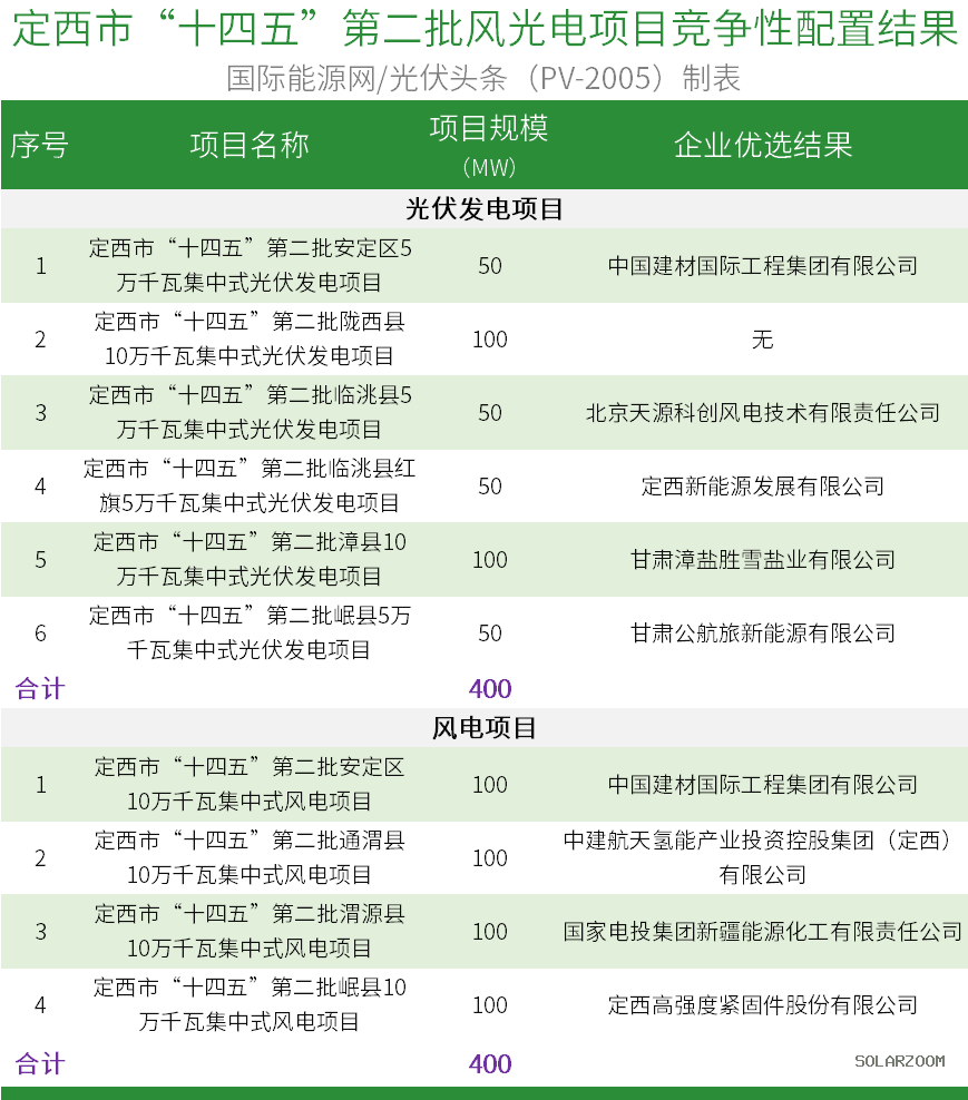 在光伏发电项目方面,中国建材国际工程集团有限公司获得安定区5万千瓦集中式光伏发电项目;北京天源科创风电技术有限责任公司获得临洮县5万千瓦集中式光伏发电项目;定西新能源发展有限公司获得临洮县红旗5万千瓦集中式光伏发电项目;甘肃漳盐胜雪盐业有限公司获得漳县10万千瓦集中式光伏发电项目;甘肃公航旅新能源有限公司获得岷县5万千瓦集中式光伏发电项目,陇西县10万千瓦集中式光伏发电项目暂时还没有企业竞得。