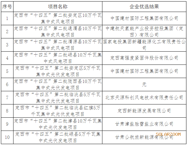 注:定西市“十四五”第二批陇西县10万千瓦集中式光伏发电项目在申报文件递交的截止时间未收到企业递交的申报文件。