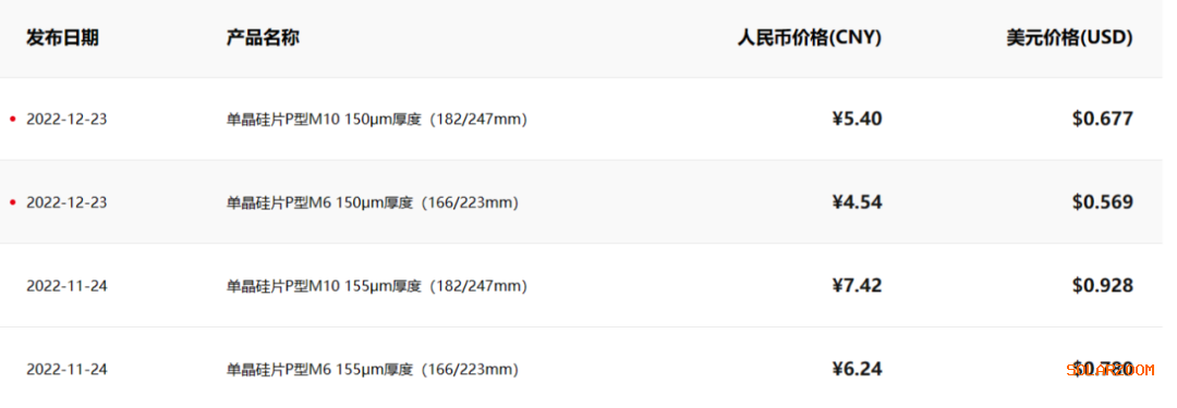 近日,“硅片双雄”再次启动一轮大幅降价。数据显示,隆基绿能最新P型M6、M10硅片报价分别为4.54元/片、5.4元/片,公司上一轮报价是在11月24日,彼时,两种型号硅片的报价分别为6.24元/片和7.42元/片。如果仅对数值进行比较的话,两型号硅片价格降幅分别均27.2%;但考虑到隆基本轮报价中硅片厚度从155μm减薄至150μm,实际降幅会略小于27.2%。