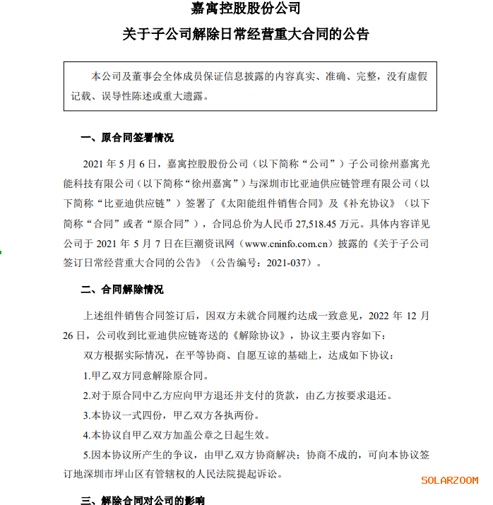 嘉寓股份28日公告,2021年5月,公司子公司徐州嘉寓光能科技有限公司与深圳市比亚迪供应链管理有限公司(简称“比亚迪供应链”)签署《太阳能组件销售合同》及补充协议,合同总价2.75亿元。上述组件销售合同签订后,因双方未就合同履约达成一致意见,12月26日,公司收到比亚迪供应链寄送的解除协议。此次解除合同是双方协商一致的结果,截至目前,该项目已确认收入2774.73万元。该合同的解除不会对公司后续业务经营产生不利影响。