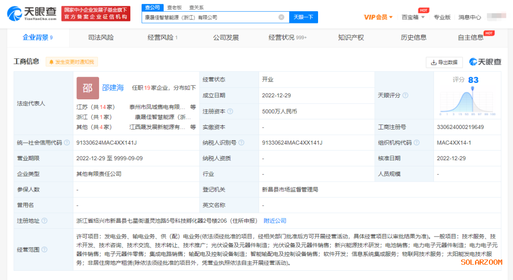 天眼查App显示,近日,康晟佳智慧能源(浙江)有限公司成立,法定代表人为邵建海,注册资本5000万人民币,经营范围包括光伏设备及元器件制造;光伏设备及元器件销售;新兴能源技术研发;电池销售;集成电路销售;物联网技术服务;太阳能发电技术服务等。股东信息显示,该公司由江苏晟高电气有限公司、康佳集团股份有限公司共同持股。