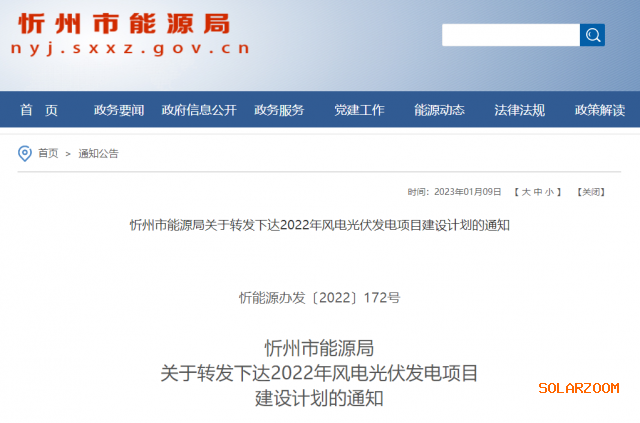 1月9日,山西忻州能源局官网发布“关于转发下达2022年风电光伏发电项目建设计划的通知”。