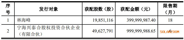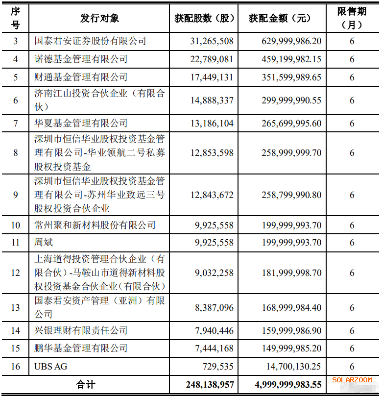 1月18日,东方日升(300118.SZ)公布公司创业板向特定对象发行股票发行情况报告书,此次发行价格为20.15元/股,发行股数约为2.48亿股,募集资金总额为约50亿元。此次发行对象最终确定为16家,具体配售结果如下: