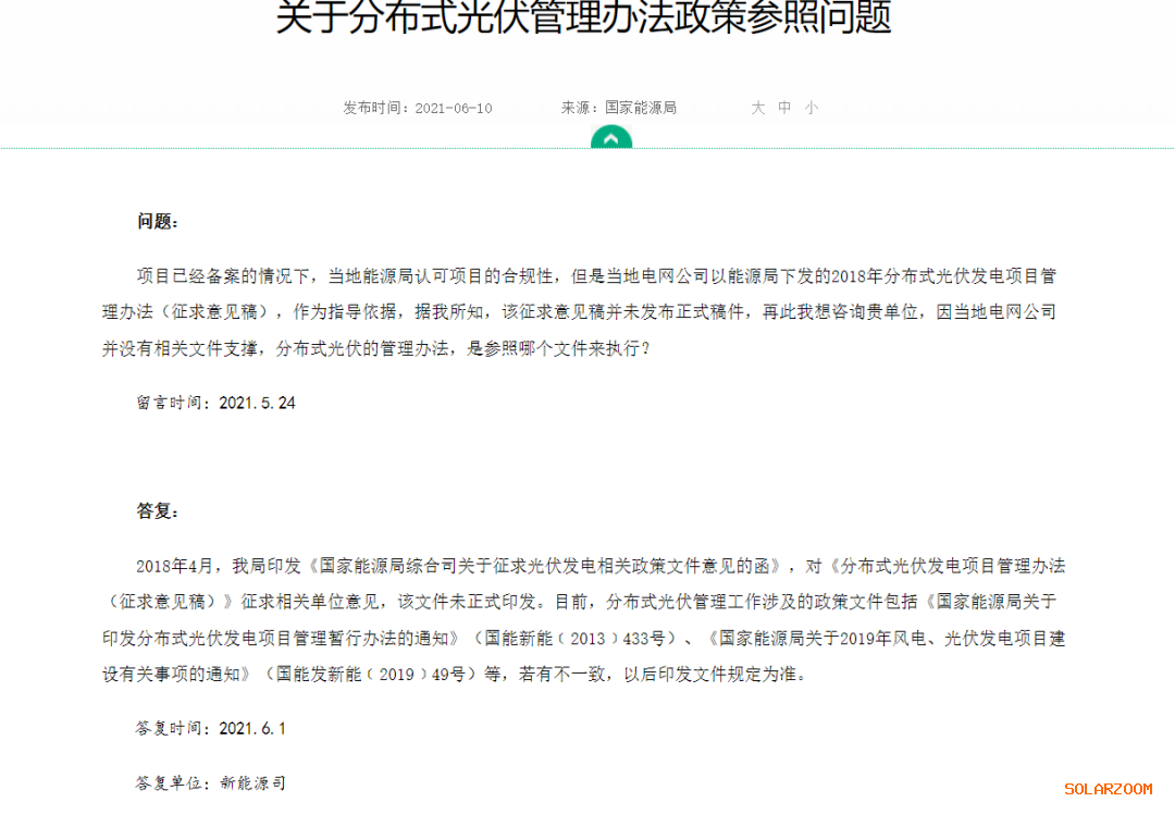 针对此问题,行业人士曾经在国家能源局网站进行提问:关于分布式光伏管理办法政策参照问题。国家能源局给出的答复为:2018年4月,我局印发《国家能源局综合司关于征求光伏发电相关政策文件意见的函》,对《分布式光伏发电项目管理办法(征求意见稿)》征求相关单位意见,该文件未正式印发。目前,分布式光伏管理工作涉及的政策文件包括《国家能源局关于印发分布式光伏发电项目管理暂行办法的通知》(国能新能﹝2013﹞433号)、《国家能源局关于2019年风电、光伏发电项目建设有关事项的通知》(国能发新能﹝2019﹞49号)等,若有不一致,以后印发文件规定为准。