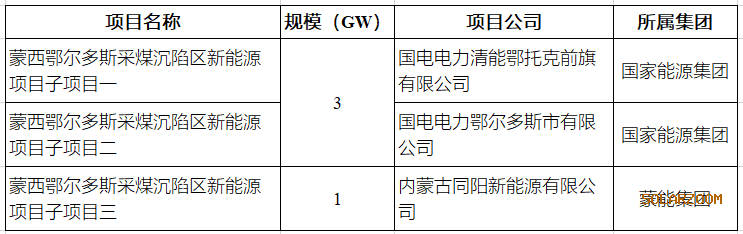 蒙西鄂尔多斯采煤沉陷区新能源项目共分三个子项目。其中,国家能源集团获得两个子项目,总规模为3GW,蒙能集团获得一个子项目,规模为1GW。