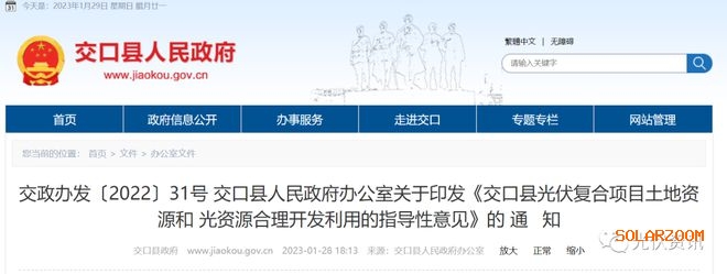 近日记者了解到,1月28日,陕西省交口县人民政府发布《交口县光伏复合项目土地资源和光资源合理开发利用的指导性意见》通知。