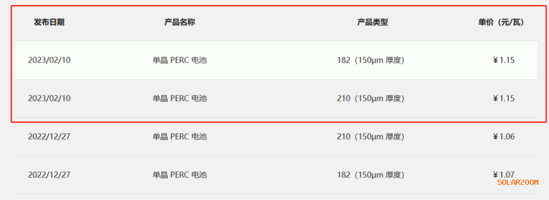 单晶210(150μm厚度)电池报价 1.15元/W,与上期报价相比上涨0.09 元/W;