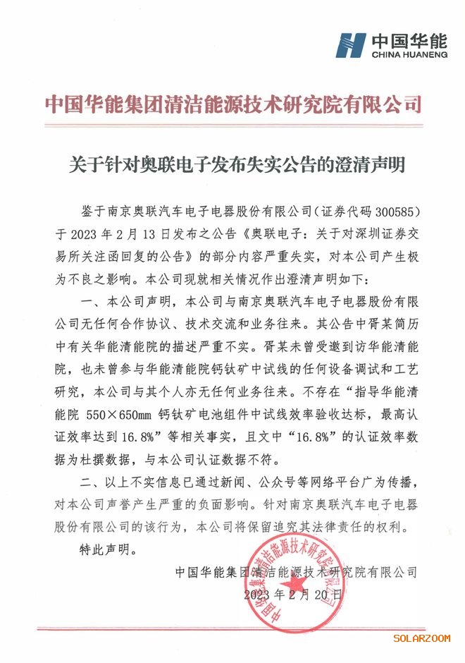 一、本公司声明,本公司与南京奥联汽车电子电器股份有限公司无任何合作协议、技术交流和业务往来。其公告中胥某简历中有关华能清能院的描述严重不实。胥某未曾受邀到访华能清能院,也未曾参与华能清能院钙钛矿中试线的任何设备调试和工艺研究,本公司与其个人亦无任何业务往来。不存在“指导华能清能院550×650mm钙钛矿电池组件中试线效率验收达标,最高认证效率达到16.8%”等相关事实,且文中“16.8%”的认证效率数据为杜撰数据,与本公司认证数据不符。