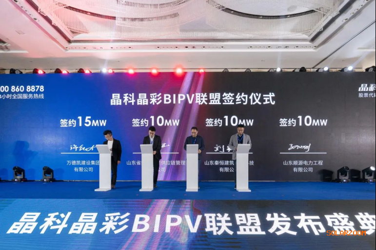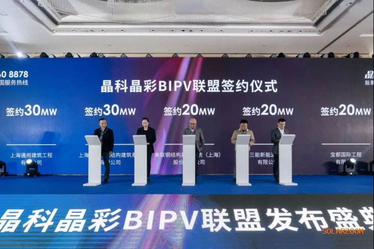 3月2日,由中国建筑金属结构协会建筑钢结构分会、浙江省光伏产业技术创新战略联盟指导,晶科能源主办的主题为“聚领晶彩 先人一步”晶科晶彩BIPV联盟发布盛典在浙江海宁圆满召开。活动广邀行业专家、产业价值链中下游企业代表齐聚一堂,就BIPV发展现状及前景展望进行了深度交流。得益于晶科晶彩BIPV解决方案强劲性能优势的展现,会上,晶科能源还一举拿下了14家企业产品供货订单,总计容量达400MW。
