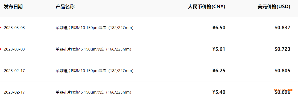 3月3日,隆基绿能官网公示硅片最新价格,单晶硅片P型M10 150μm厚度(182/247mm)报价6.5元/片,涨幅4%;P型M6 150μm厚度(166/223mm)硅片报价为5.61元/片,涨幅3.89%。