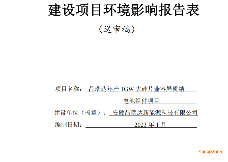 2023年3月10日,我局受理了《安徽晶瑞达新能源科技有限公司晶瑞达年产1GW大硅片兼容异质结电池组件项目环境影响报告表》,现对该报告全本进行公示,请相关公众在5个工作日内将有关意见书面反馈蚌埠市固镇县生态环境分局。