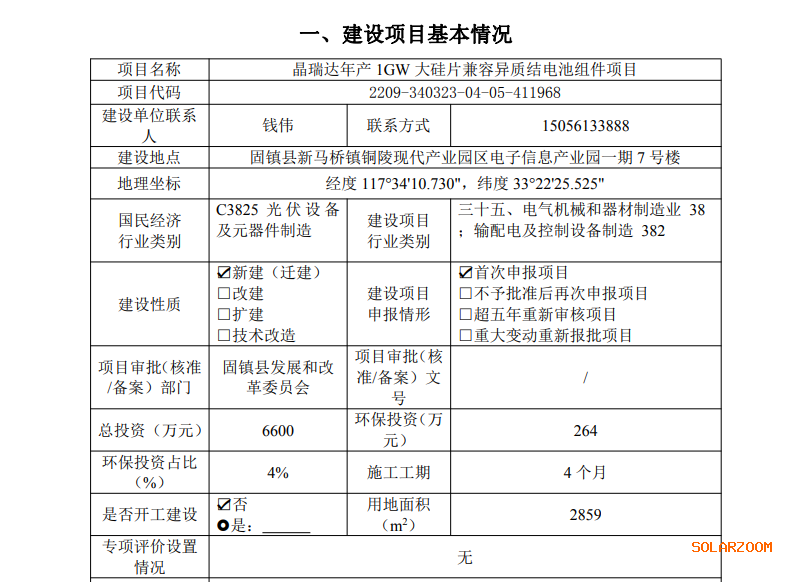 1、项目名称:年产1GW大硅片兼容异质结电池组件项目;