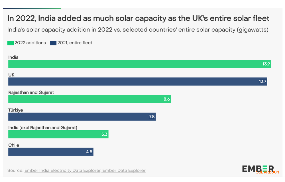 根据市场情报公司Ember的数据,印度在2022年一年内新增太阳能光伏装机达到13.9GW,远远领先于英国(13.7GW)、土耳其(7.8GW)和智利(4.5GW)等几个国家的累计太阳能部署。其中拉贾斯坦邦和古吉拉特邦以8.6GW的新增装机遥遥领先。