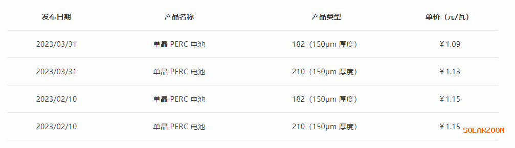 单晶182(150μm厚度)电池报价1.09元/W,与上期报价相比下降0.06 元/W;