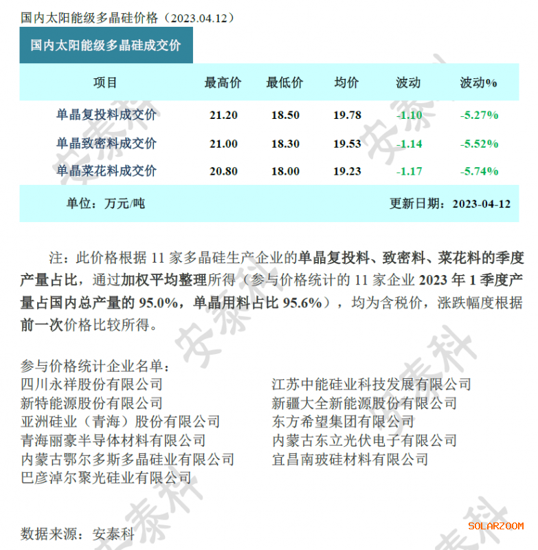 本周国内单晶复投料价格区间在18.5-21.2万元/吨,成交均价为19.78万元/吨,周环比降幅为5.27%;单晶致密料价格区间在18.3-21.0万元/吨,成交均价为19.53万元/吨,周环比降幅为5.52%。