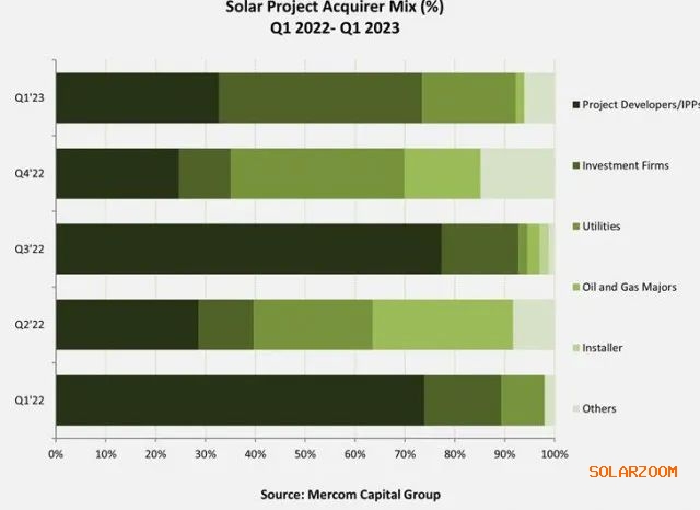 投资公司和基金是2023年第一季度最大的收购方,收购了4.8GW以上的光伏项目。项目开发商和独立电力生产商紧随其后,收购了390GW的光伏项目;电力公司收购了2.2GW的光伏项目;石油和天然气巨头收购了200MW的光伏项目。