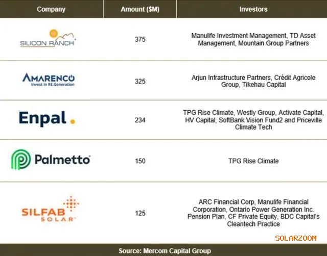 光伏开发商Silicon Ranch公司以3.75亿美元的最高风投资金位居榜首。其他融资最多的光伏开发商依次为Amarenco公司(融资3.25亿美元)、Enpal公司(2.34亿美元)、Palmetto 公司(1.5亿美元)。以及Silfab Solar公司(1.25亿美元)。