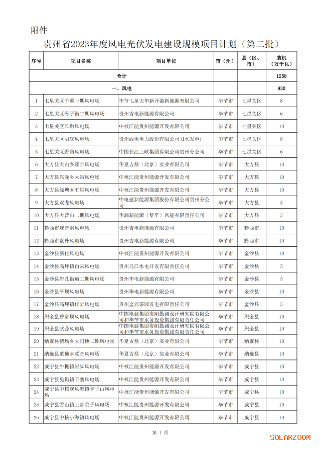 为推进新能源产业健康持续发展,根据《贵州省风电光伏发电项目管理暂行办法》《省能源局关于进一步加强新能源项目管理有关工作的通知》有关要求,现下达2023年度风电光伏发电建设规模项目计划(第二批),总装机为1258万千瓦,其中风电930万千瓦,光伏发电328万千瓦,拟全部接入贵州电网。