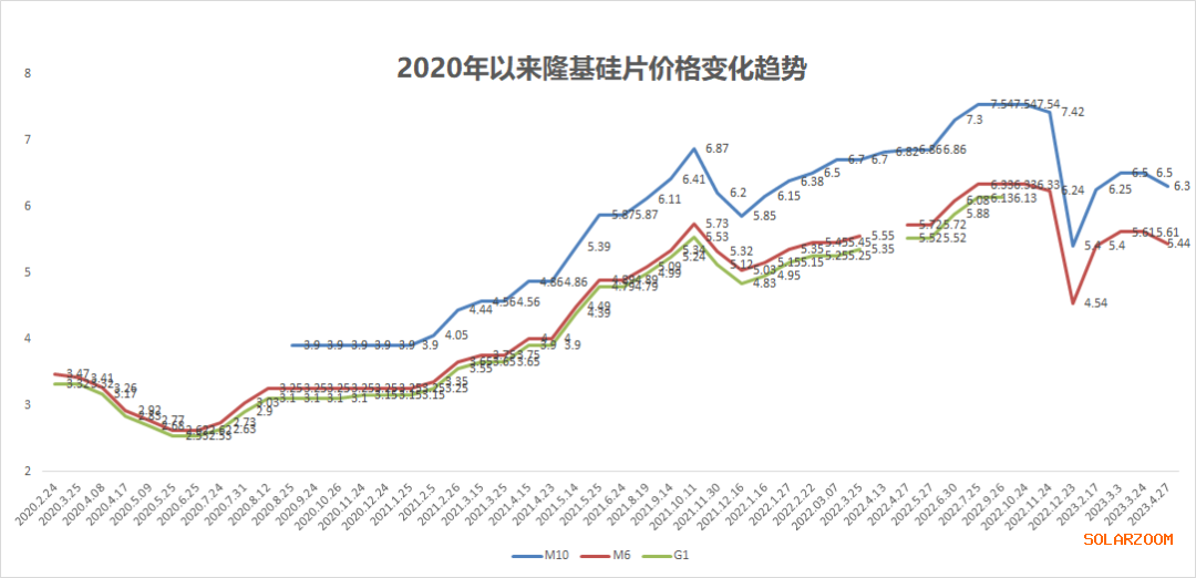 最新报价显示,M6硅片报5.44元,降价0.17元;M10硅片报6.30元,降价0.20元。