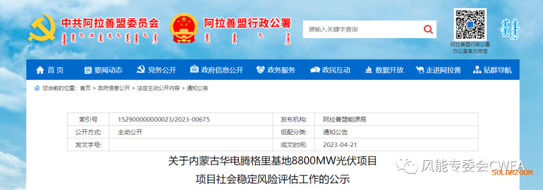 关于内蒙古华电腾格里基地8800MW光伏项目社会稳定风险评估工作的公示