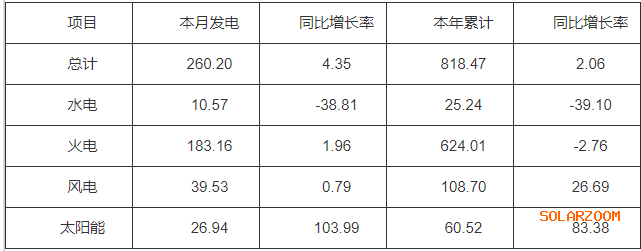 (一)发电量情况。3月份当月,全省发电量260.20亿千瓦时,同比增加4.35%。其中水电10.57亿千瓦时,同比减少38.81%;火电183.16亿千瓦时,同比增加1.96%;风电39.53亿千瓦时,同比增加0.79%;太阳能26.94亿千瓦时,同比增加103.99%。
