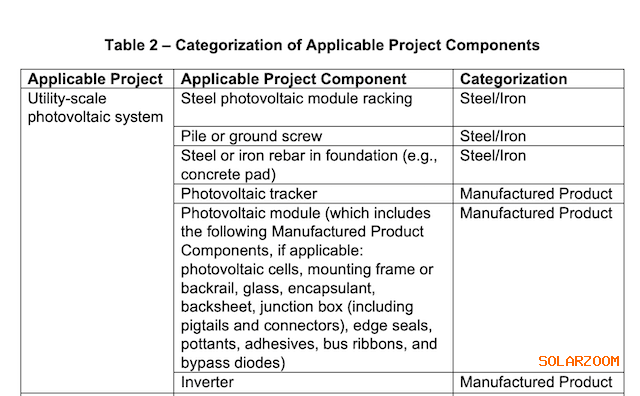 现在,美国财政部终于公布了所有细节。文件显示,典型的太阳能设施中的“制成产品”包括,光伏追踪器、光伏模块和光伏逆变器。其中,光伏模块涵盖光伏电池、安装框架或背板、玻璃、封装剂、背板、接线盒(包括尾纤和连接器)、边缘密封条、陶器、粘合剂、母线和旁路二极管。