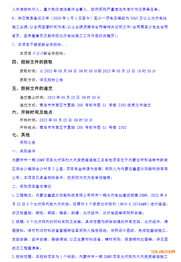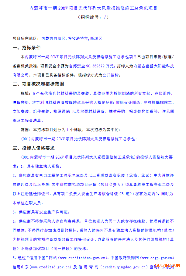 5月9日,内蒙古鑫盛太阳能发布一份修复光伏阵列的招标公告,主要招标内容为修复被大风吹翻的5个光伏阵列。