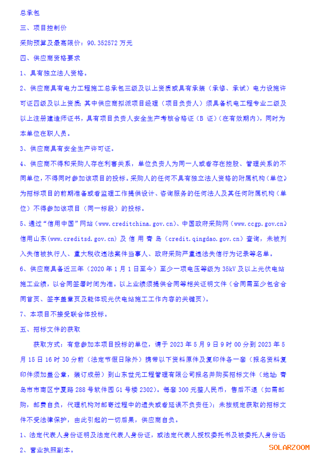 文件显示,本次招标为限价招标,限额为90.352572万元,折合单价约3.52元/瓦。根据企查查数据显示,本次招标业主为青岛昌盛日电。