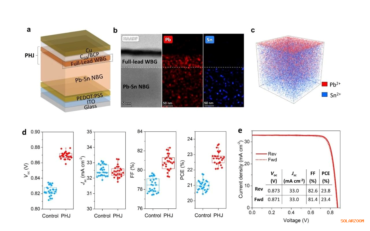 为解决上述瓶颈,本研究设计了新型的3D/3D双层钙钛矿异质结(PHJ)结构:利用真空蒸发和溶液加工混合法,在铅-锡混合窄带隙钙钛矿薄膜上生长一层数十纳米厚的三维纯铅宽带隙钙钛矿薄膜(FL-WBG)(见图1a-c)。通过调控三维纯铅宽带隙钙钛矿的组分,使其与窄带隙钙钛矿形成Type-II型异质结结构,促进载流子(电子)从钙钛矿吸光层向电子传输层抽取,降低钙钛矿/电子传输层C60之间的界面复合损失,显著提升了电池的开路电压、填充因子和光电转换效率(图1d),最佳性能的窄带隙钙钛矿电池光电转换效率达到了23.8%(图1e),为目前报道的最高效率。