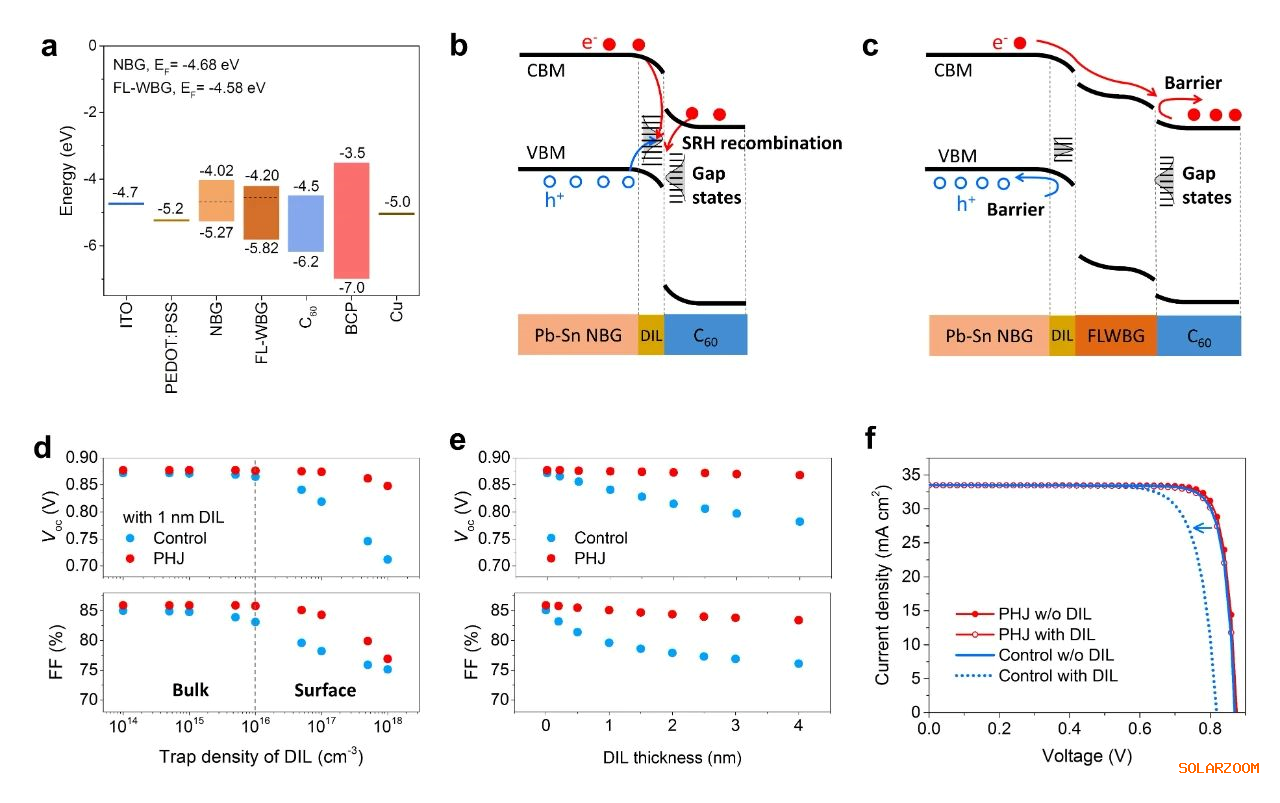 图2. 有/无PHJ的铅锡钙钛矿的能级关系图和模拟的光伏性能。a, PHJ 铅锡钙钛矿太阳能电池各功能层的能级排列。b-c,能带弯曲后的Control和PHJ铅锡钙钛矿太阳能电池的能级图;红线和蓝线分别表示非辐射复合路径和载流子漂移方向。d-e, 1D-SCAPS电学模拟:在具有不同缺陷密度(d)和厚度(e)的缺陷层下,Control和PHJ铅锡钙钛矿的光伏性能。f, 1D-SCAPS电学模拟:在有/无DIL时,Control和PHJ铅锡钙钛矿太阳能电池的J-V曲线。