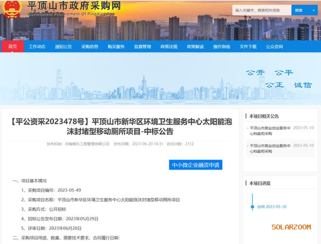 6月20日,平顶山市政府采购网发布平顶山市新华区环境卫生服务中心太阳能泡沫封堵型移动厕所项目-中标公告,中标供应商为:河南聚海环保设备有限公司,中标金额为2155.23万元,交货及安装期为签订合同之日起90日历天,该项目不接受联合体投标。