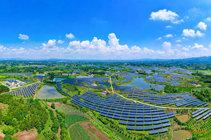 近日,航拍江西省瑞金市30兆瓦市级地面集中式光伏电站,一排排光伏发电板与周边青山、农居、田园相映成趣,呈现一派乡村振兴的美景。