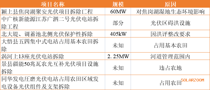 此外,其他项目因光伏区碍洪设施、位于红线区内、洪评、占据河道等原因,均导致了因用地为题的拆除,部分项目其拆除后尚能异地重建,更多的项目则只能对设备进行妥善保存或以二手名义在相关网站进行招拍挂。