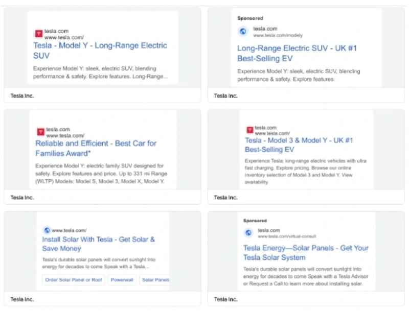 我们从网络上获悉,特斯拉首次尝试在谷歌上投放商业广告。目前已经投放了18条广告,主要涉及特斯拉Model 3/Y车型以及太阳能业务,集中在英国和美国地区。