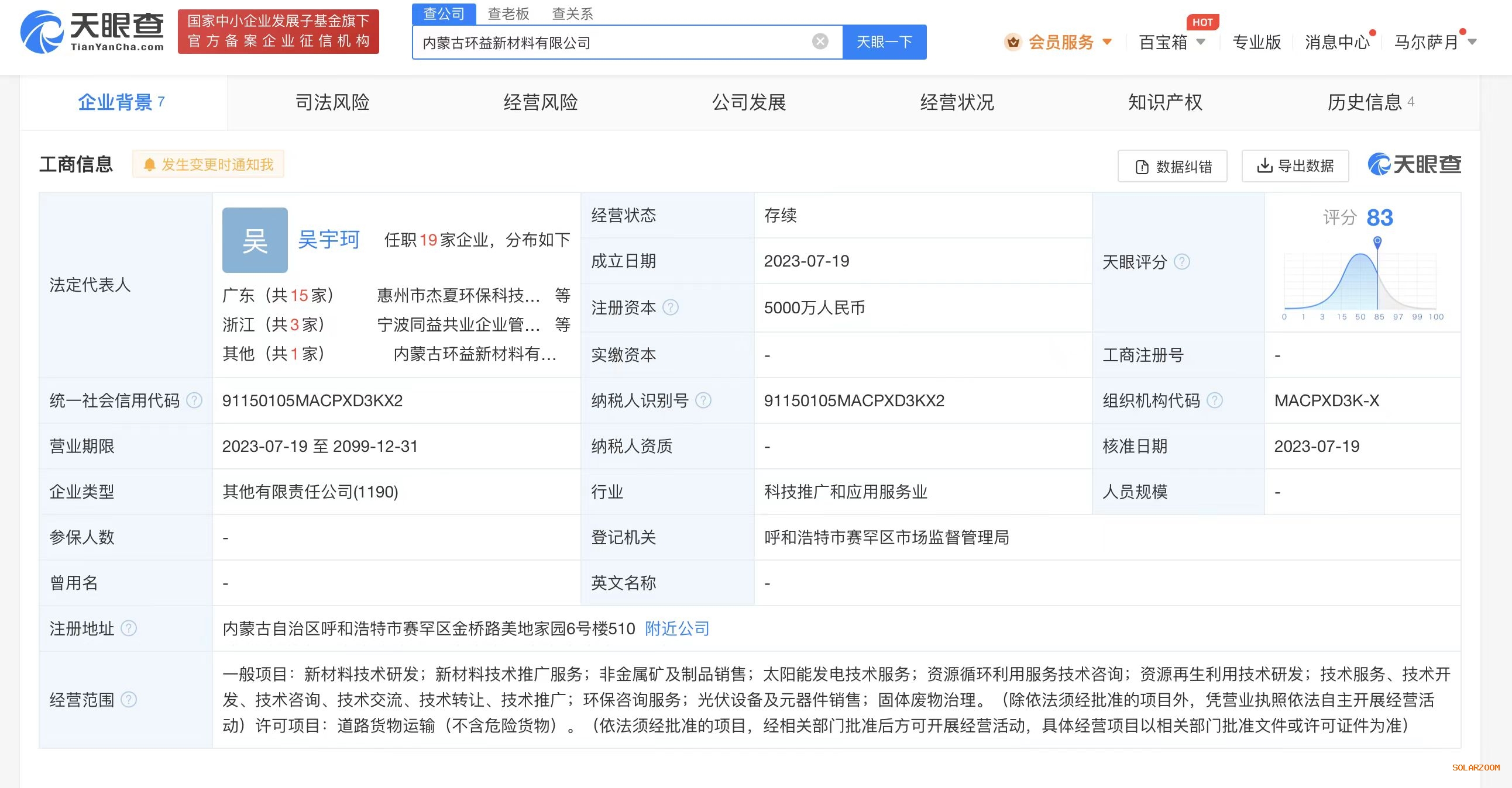 天眼查App显示,近日,内蒙古环益新材料有限公司成立,法定代表人为吴宇珂,注册资本5000万,经营范围含新材料技术研发、非金属矿及制品销售、太阳能发电技术服务、资源循环利用服务技术咨询、光伏设备及元器件销售、固体废物治理等。股东信息显示,该公司由深圳市TCL环境科技有限公司、张佳颖共同持股。