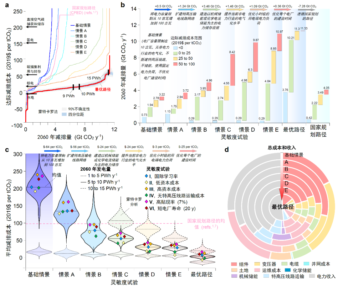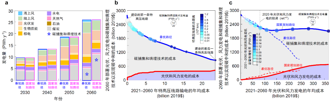 在2060年碳中和条件下,该研究通过综合考虑陆地碳汇、非电力部门电气化以及除光伏和风能以外的可再生能源发电量,比较了发展太阳能光伏和风能发电与使用其它清洁能源(水电、生物质、核能等)对成本的影响,并分析了增加特高压输电线路投资对光伏和风力发电成本的影响。结果表明,为了达到2060年碳中和目标,如果按照当前规划的太阳能光伏和风能发电建造速度,太阳能和风能资源相对有限,需要较多的碳捕获与封存(每年需要接近20万亿千瓦时的装机量),造成较高的减排经济成本,而该研究的优化模型以较低的成本增加太阳能光伏和风能发电,发电量可从每年9万亿千瓦时增加到每年15万亿千瓦时,减排成本可从每吨二氧化碳约700元降低到每吨二氧化碳约40元,大大增加了太阳能和风能资源的潜力,因此,增加太阳能光伏和风能有效的发电量可以降低碳减排总成本,加快我国清洁能源的发展速度。