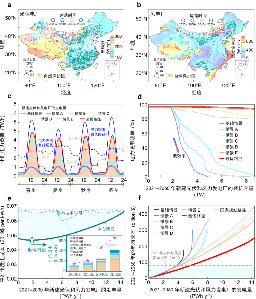 复旦领衔的研究团队基于地球系统中多年太阳辐射和风速的小时空间数据,综合考虑国家行政区划、土地类型、气候条件、地形、海拔、陆地自然保护区、海上航线、海水深度、海洋自然保护区、特高压变电站位置等空间地理信息,建立高时空分辨率的数字地球智能网络,基于五种不同的电厂形态分布和电厂各组件成本,协调统筹发展特高压线路电力运输、选择合适的储能系统类型、优化用电端电力负荷,根据平准化度电成本(LCOE)最低的原则优化出2767个光伏电厂、1066个陆上风电厂和11个大型海上风电厂的空间分布和建造规模,并基于技术学习对成本的影响优化各电厂的建造时间,制定了中国加速发展太阳能光伏和风能发电替代化石燃料的中长期建设方案。