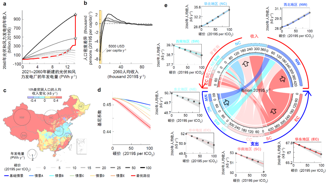 该研究基于优化的太阳能光伏和风能发展路径,解析了区域之间的资金流动情况,并量化了加快太阳能光伏和风能发展速度对减小贫富差距的影响。如果采用每吨二氧化碳700元的碳价,到2060年,光伏和风能发电的资金流动将达到年均7万亿元,是当前中国扶贫年均投资的15倍,其中,光伏发电和风电电力传输导致最大的资金流是从华东流向西北(将达到每年约14000亿元的规模),优化光电和风电的空间布局可以使最贫困的居民受益,其中西北地区的人均收入从21万元将增加到25万元。比如,复旦模型预估我国新疆地区是未来最重要的太阳能和风能资源所在地,在2060年光伏和风电厂可达到255个,装机容量约为23亿千瓦,但配套特高压线路总容量将达到20亿千瓦,储能设施容量需达到2.7亿千瓦,根据当前化石燃料价格推算出相关的年收益可达到3800亿元。