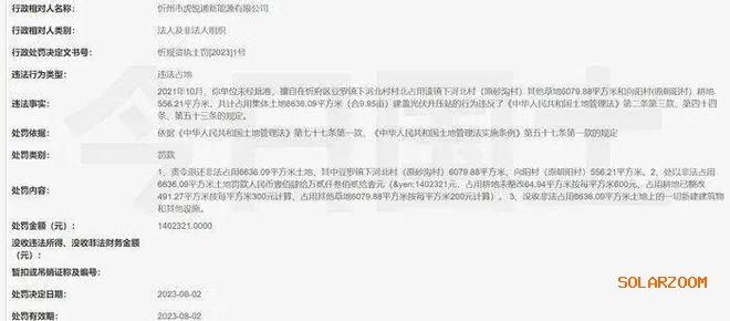 近日,山西省忻州市规划和自然资源局公布“忻规资执土罚[2023]1号”行政处罚信息,信息显示忻州市虎悦通新能源有限公司因非法占地建光伏升压站,被处以罚款140.2321万元。