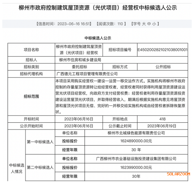 目前推出招标的项目,大多数还在前期阶段。政策推出较早的广西柳州市,据当地政府公布的信息,已经完成了对“市政府控制建筑屋顶资源(光伏项目)经营权”招标的第一阶段(下图所示)。