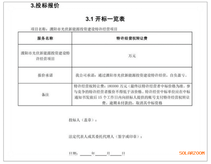 8月11日,江苏省溧阳市发布招标公告,以“转让特许经营权”的形式,为溧阳市政府控制的屋顶光伏资源寻找合格开发者。资源总量约240.8万平方米,目标安装光伏总量348.10MW,特许经营权转让费18亿。