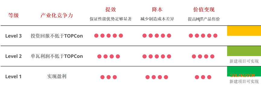 “对于跨界干光伏的企业来说,HJT进入门槛很低,只要能盈利,就可以做;但是对于头部企业来说,门槛却很高,至少要达到Level2,甚至要达到Level3,在效率、成本、产品溢价三项指标上做得更好,投资回报不能低于TOPCon。”